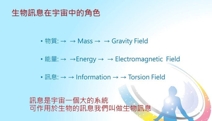 如附件一, 從物理學上來說, 生物訊息(Bio-Information)的理論基礎是來自於量子力學(Quantum Mechanics)及量子頻率(Quantum Frequency)及物理撓場(Torison Field)理論.