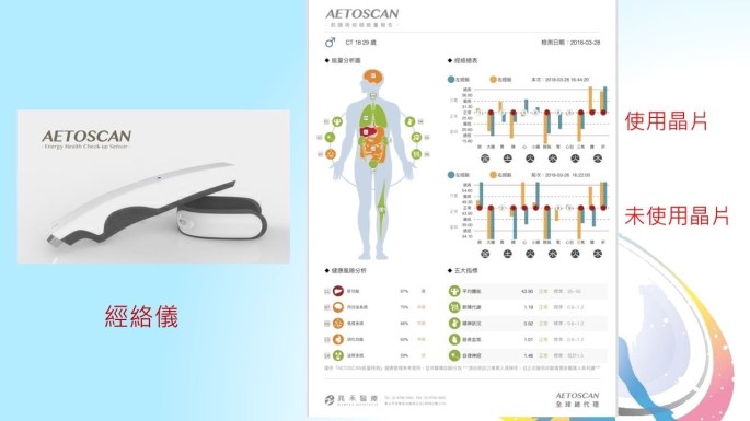 附圖三清楚顯示, 有無使用晶片, 會對於人的(左右)經絡的陰陽五行起到明顯的改變.