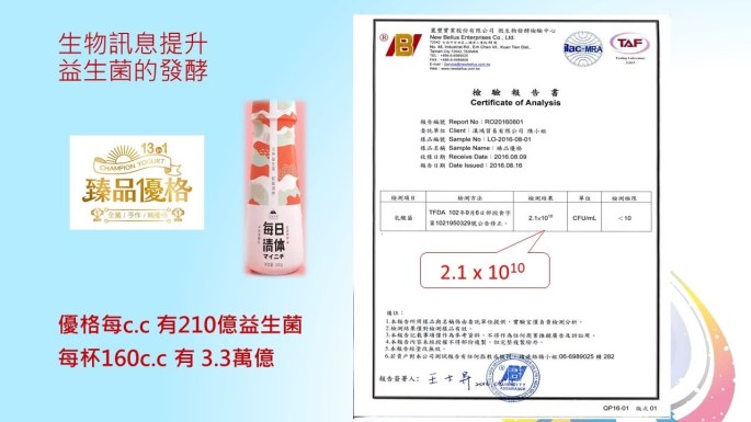 我們之前提過, 生物訊息裡面的共生訊息, 可以使得多達13種不同的益生菌(個性迴異, 發酵條件不同甚至相剋)的菌粉配方, 同步共生發酵後, 可以高達每杯 (160 C.C.) 優格檢測出 3.2兆(萬億)的總菌數. 目前這應該是世界紀錄. 附圖五就是檢測報告.